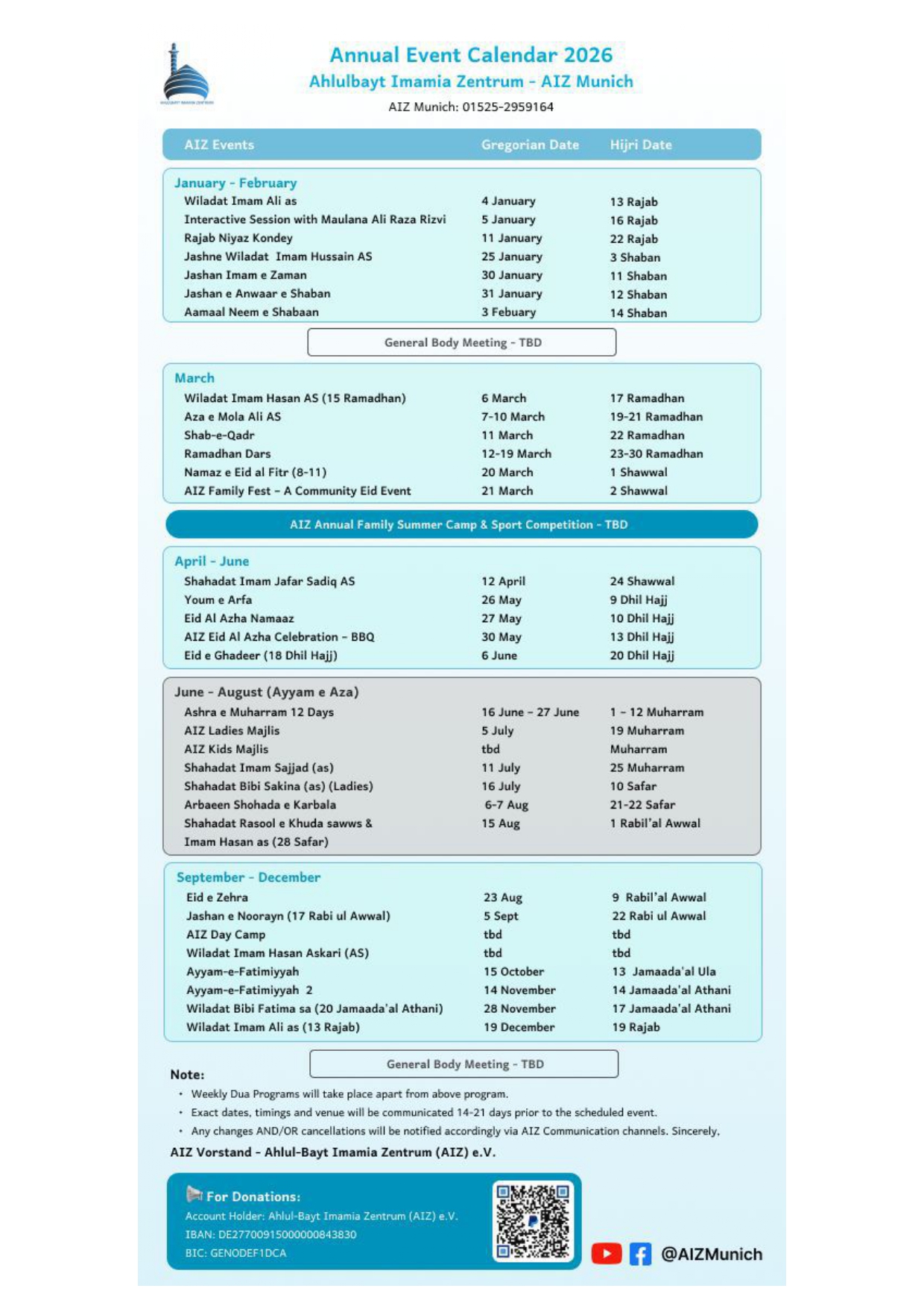 Your support helps us spread the message of Imam Hussain (AS) and uphold the rich traditions of the Ahlul-Bayt (AS) within the Shia Ithna Asheri community in Munich.